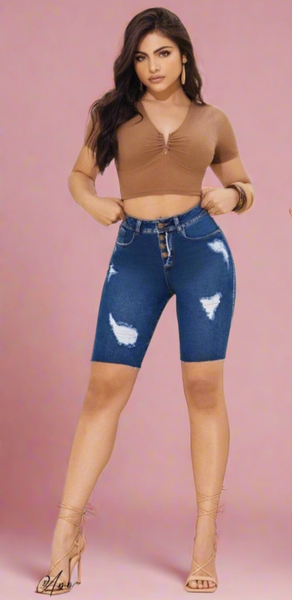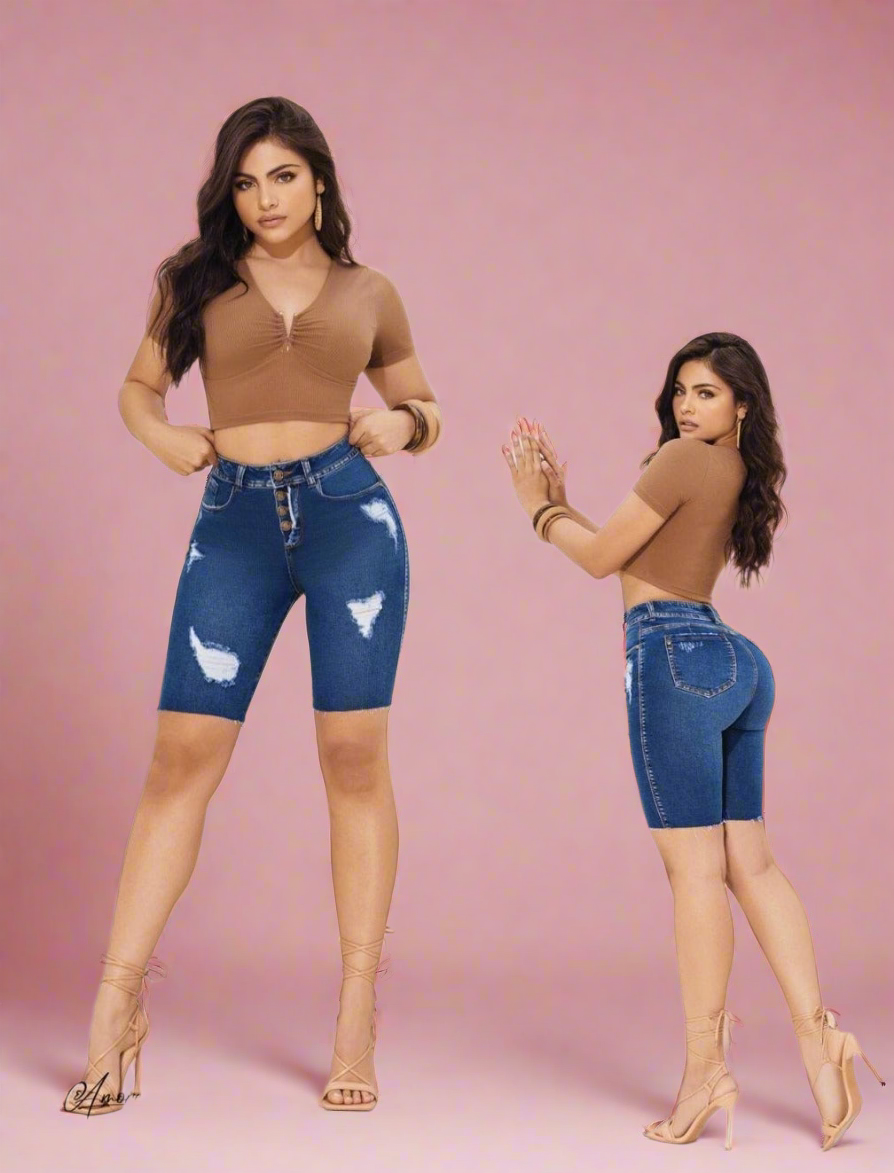 BELIZE Colombian Push Up Biker Capris. These unique capri shorts feature a comfortable high-waist with a chic four-button closure and built-in tummy control for a sleek silhouette. Crafted from a semi-rigid fabric in a versatile medium blue wash, the BELIZE capris stand out with stylish distressed details on the front, offering a modern look that is adjusted and tight-fitting on the leg.