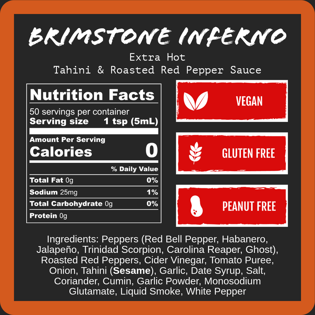 Brimstone Inferno takes our Grand Champion Mediterranean sauce and amplifies everything. Same roasted red pepper depth. Same creamy tahini body. Same fragrant spices. But now with a 9/10 superhot trio that transforms it from a slow burn into a full inferno.