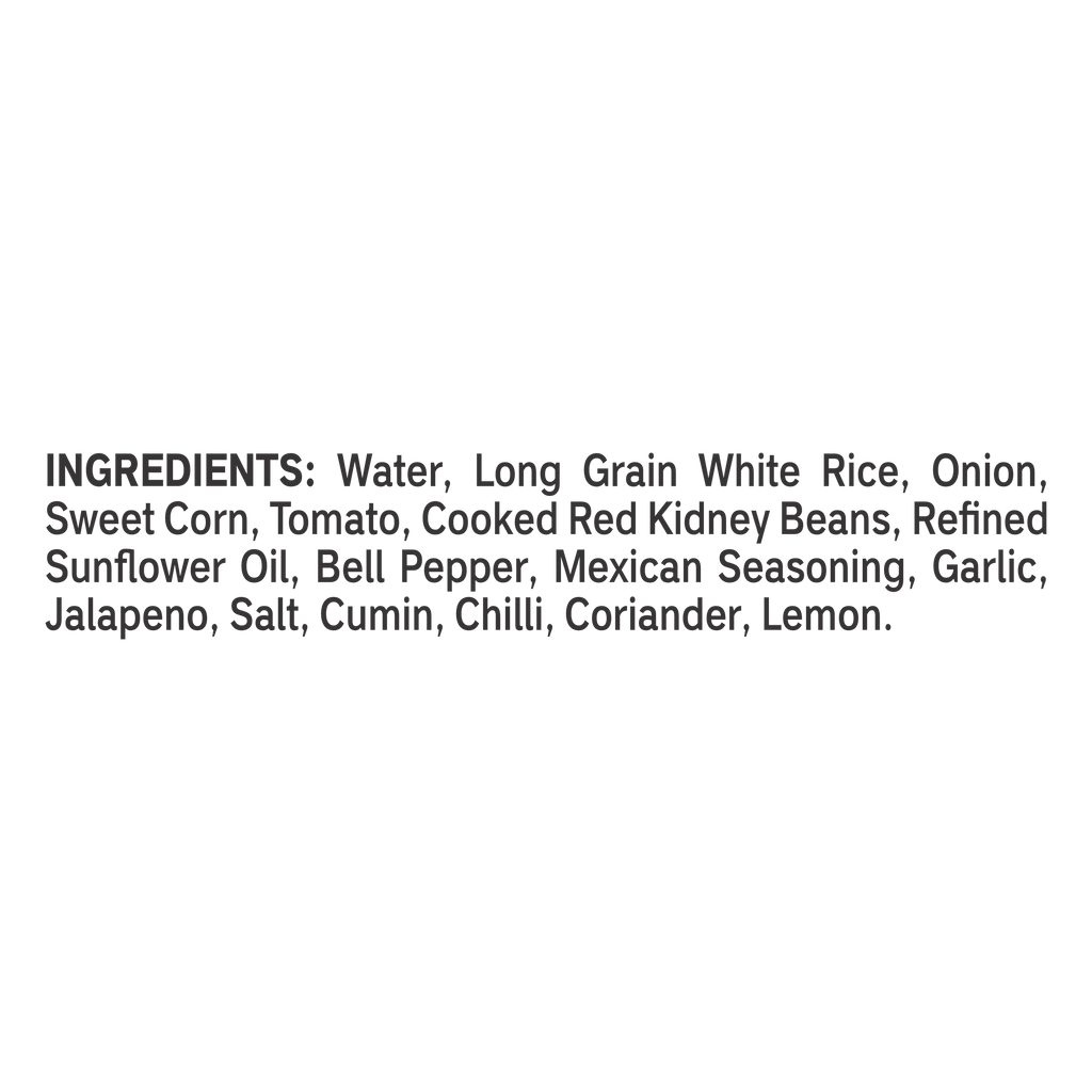 Water, Long Grain White Rice, Refined Sunflower Oil, Sweet Corn, Green Peas, Salt, Red Bell Pepper, Carrot, Tomato, Soya Powder, Sugar, Garlic, Yeast Extract, Onion, Soya Sauce, (Soybeans, Salt, Rice, Sugar, Water), Guar Gum, Xanthan Gum, Lactic Acid, White Pepper.