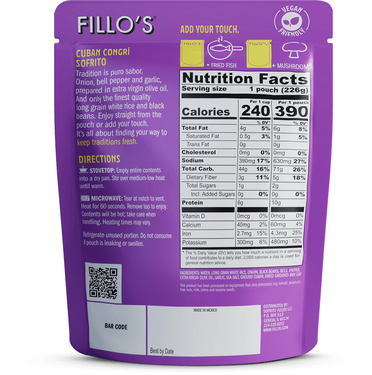 Congri is a Cuban staple—not just rice and beans, but rice cooked with beans and sofrito, in extra virgin olive oil. Our preparation is as traditional as it gets. Heat, grab and spoon and dive in. Non-GMO Project Verified, shelf-stable, ready to eat, vegan friendly, plant protein, made with Extra Virgin Olive Oil. 6 pouches per case, 8 ounces each.