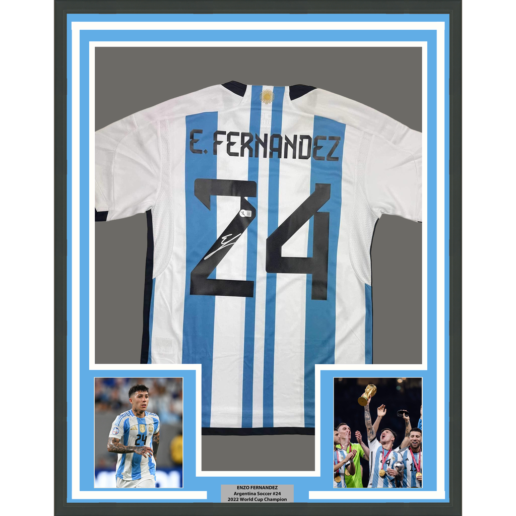 Framed Autographed/Signed Enzo Fernandez 35x39 Argentina Blue/White Soccer World Cup Jersey Beckett BAS COA