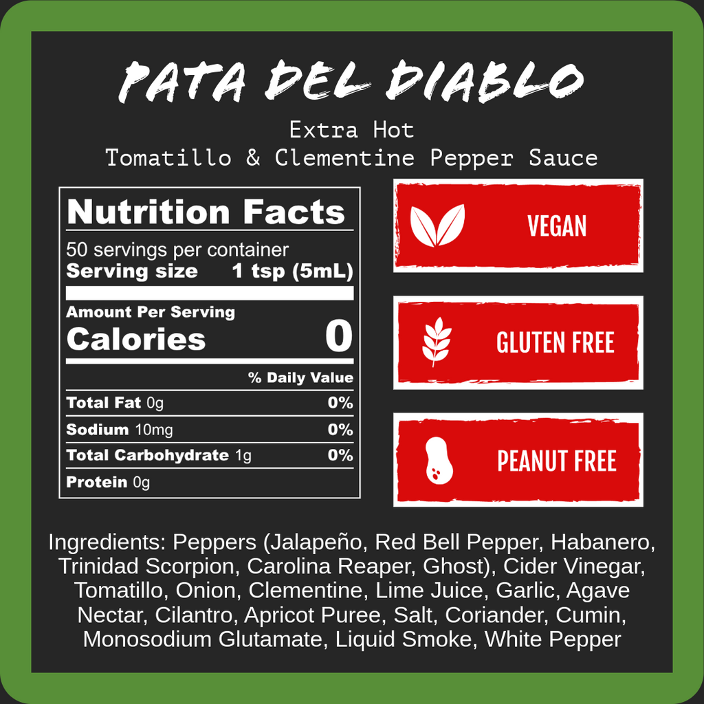 Pata del Diablo, "The Foot of the Devil", takes everything you love about our original Cinco and cranks the heat to 9/10. Same smoky tomatillo base. Same juicy clementine brightness. Same bold Latin spices. But now with a superhot pepper trio that'll make you question your life choices (in the best way).