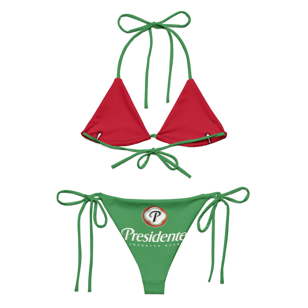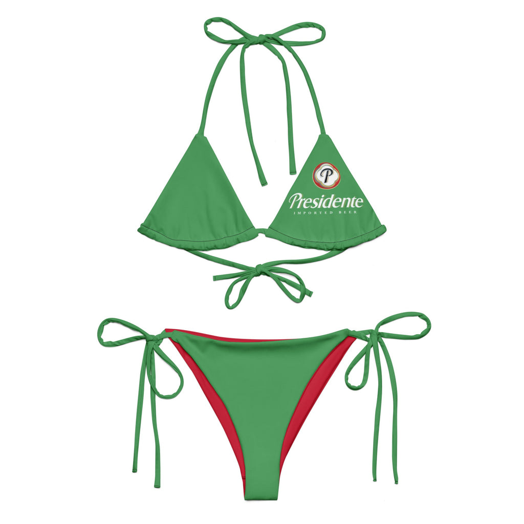 Turn up the heat and rep your favorite brew with this bold and tropical Dominican Republic Presidente Beer String Bikini! This vibrant green swimsuit features the iconic Presidente logo on the bottoms and is perfect for beach parties, Caribbean carnivals, or poolside chill days with a cold one in hand.